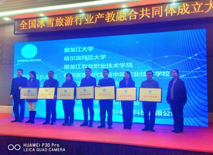 哈尓滨商业大学、黑龙江旅游职业技术学院、亚布力阳光度假村有限公司3家单位为该共同体发起单位。哈尓滨师范大学、黑龙江大学、吉林外国语大学等国内20余家涉旅院校及企业等为副理事长单位。省文旅厅于峰副厅长、省商务厅王显华副厅长、省教育厅二级巡视员丁哲学等领导莅临大会并致辞。会上开启理事长单位、副理事长单位授牌仪式,审议了共同体章程,并举办冰雪旅游产教融合和研学专业资源库建设学术研讨会。