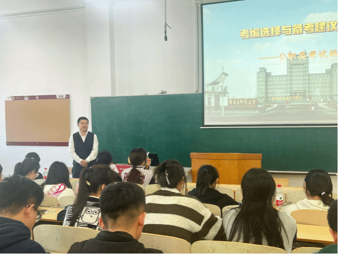 举办促就业专题讲座,特邀历史系校友、长期关注公职类考试的李珣老师在人文楼608教室作了题为“考编选择与备考建议”的讲座。学院2020、2021级历史学、文物保护技术专业本科生和部分研究生聆听讲座。