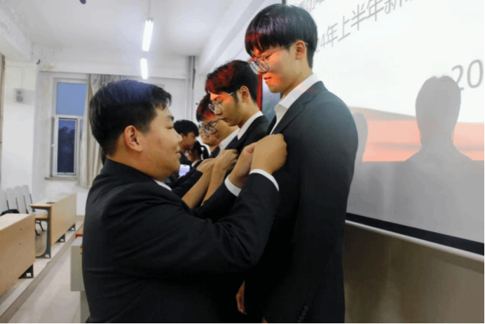 老团员代表上台为新团员佩戴团徽。这一刻,新老团员的心紧紧相连,共同感受着团组织的温暖和力量。老团员郑重地将团徽佩戴在新团员胸前,象征着将团组织的优良传统和使命传递给新一代的青年。