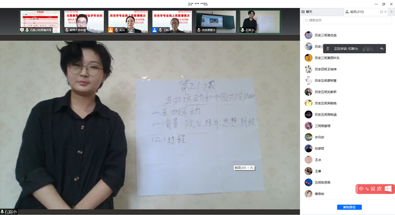 本次活动设腾讯会议室和线上直播两个会场,历史系四个年级共计500余人全员参与,学院部分教师、研究生及旅游、文保两个专业的同学也参与了观摩。最后,杨超院长发表讲话,充分肯定了此次活动的重大意义,并对同学们的教学技能提升提出殷切期望。