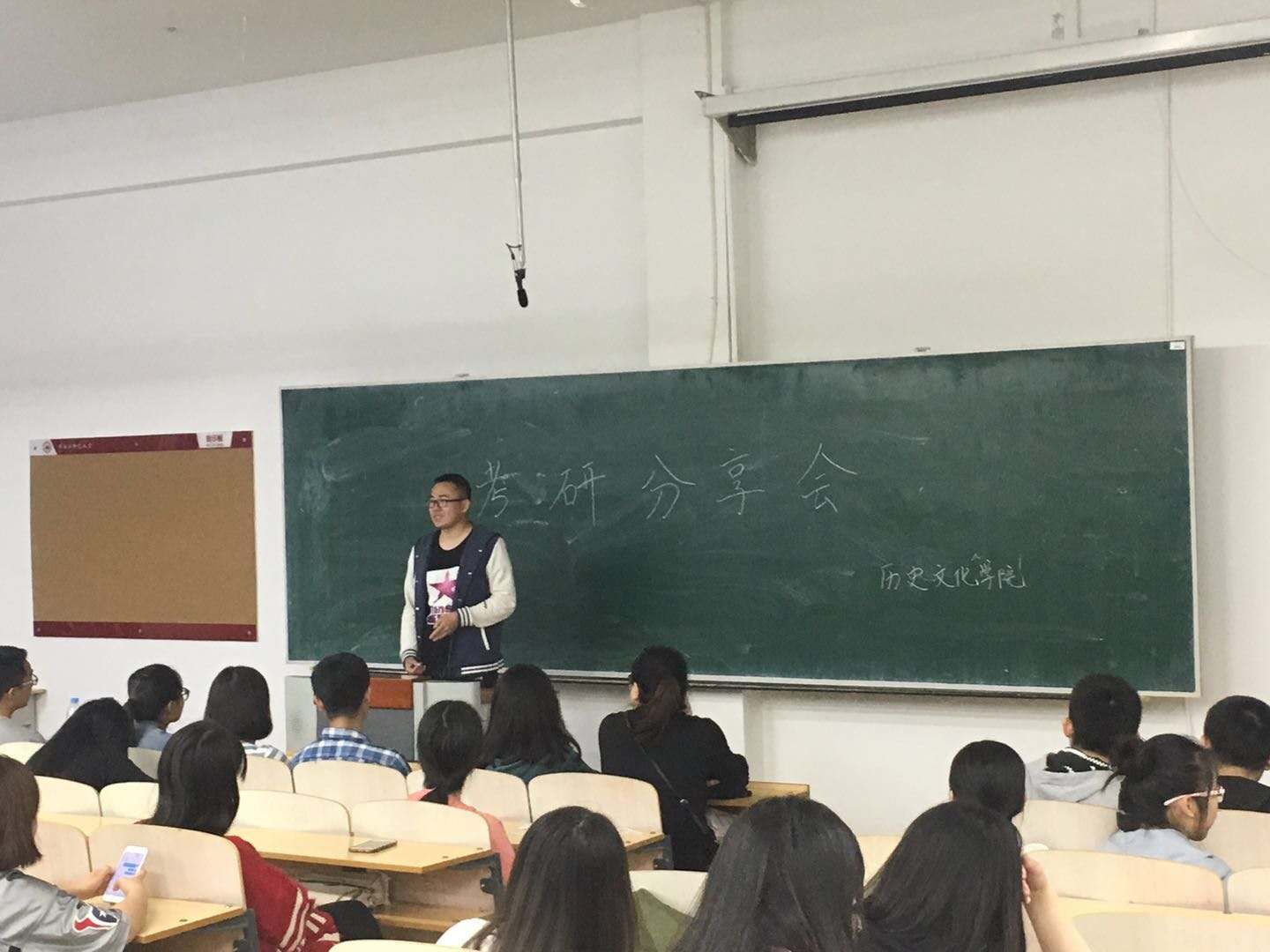 本次交流会请到了历史学专业、旅游管理专业、文物保护专业以及跨考心理学专业的2014级考研学生。他们结合自己考研的亲身经历进行分享。主要就为什么要考研、如何合理选择学校、如何规划学习计划、应该注意哪些细节,以及调剂技巧等同学们最为关心的问题向现场的同学做了详细讲解,他们还贴心地为大家介绍了各科目、各阶段的备考方案,并推荐了在备考过程中的复习资料。