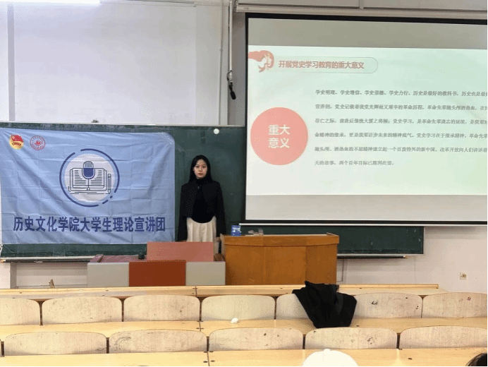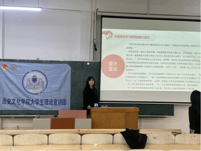 宣讲团成员孙佳凝同学以党的二十大胜利召开的重大意义为切入点,阐述了百年党史是一部为人民谋幸福、为民族谋复兴的初心践行史,是紧紧依靠人民的实干史。同时,强调了学习党史的重要性与必要性,引导同学们要积极学习党的二十大精神,坚定理想信念。