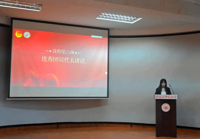 杜欣泽同学代表老团员上台发言。杜欣泽呼吁青年团员应该坚定理想信念,努力奋斗,为祖国的繁荣昌盛贡献我们的智慧和力量。