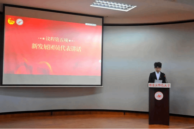 新发展团员代表康明同学上台发言。他表示将以入团为起点,努力提升自我,积极参加团学活动,以实际行动践行团员的职责和使命。
