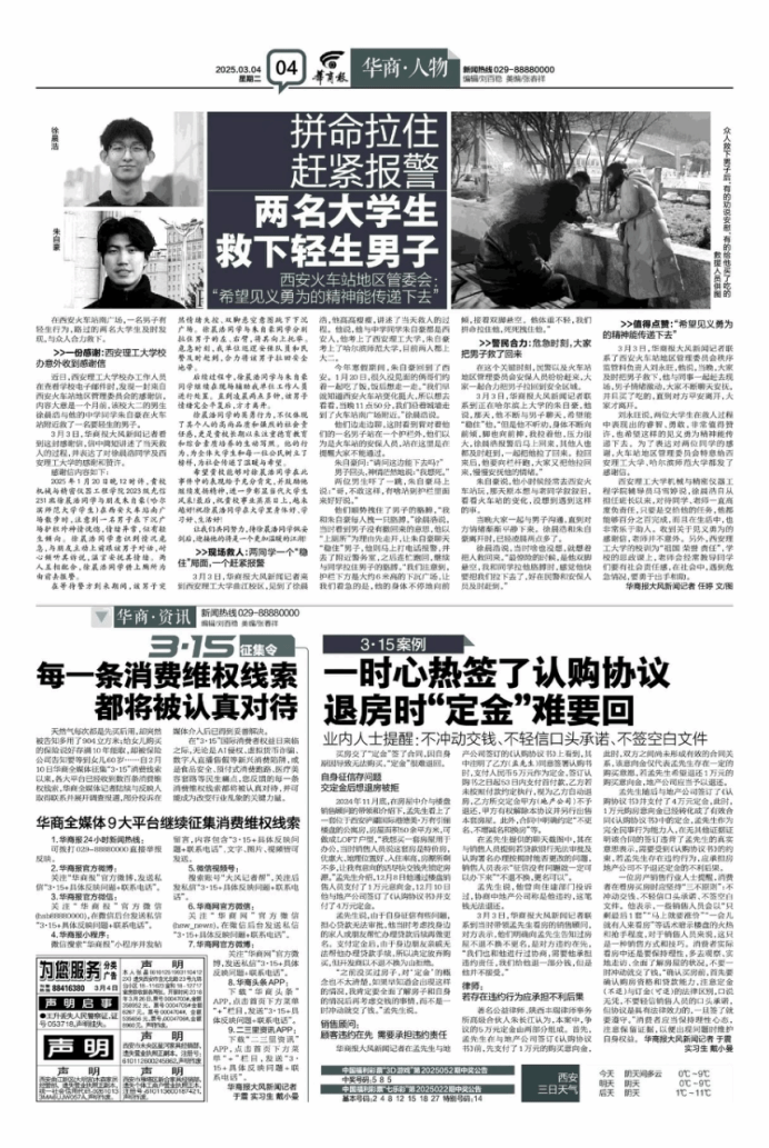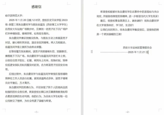 朱自豪同学和他的高中同学徐晨浩在火车站附近救了一名轻生男子。朱自豪同学的见义勇为事迹广泛受到陕西电视台、华商报等主流媒体的报道。