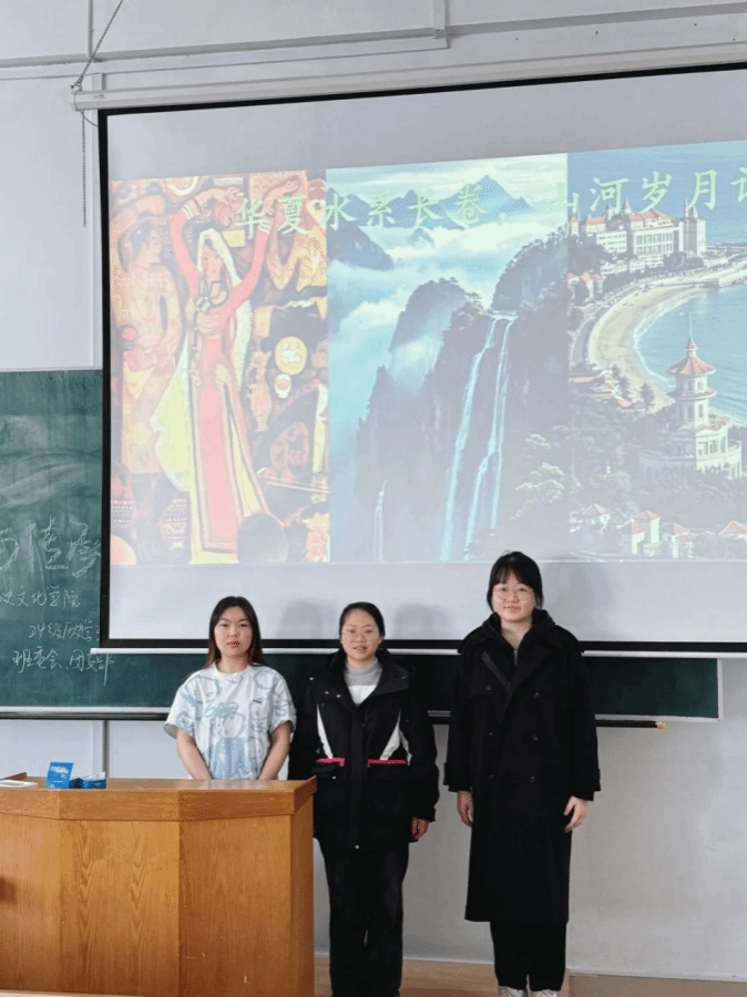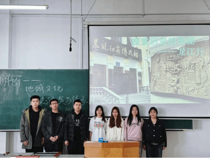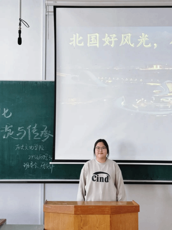 第一组同学带来的主题是“探索黑龙江的奥秘”。作为土生土长的黑龙江人,班长张宁涵带领省内同学为大家带来了一场精彩纷呈的龙江文化讲解。小组成员赵子维、陈馨悦、曹文博杨、王禹涵、张旭、张景然等同学依次上台,对黑龙江的文化进行解读与分享,文物遗址的图片和生动的讲解让台下的同学们沉浸其中,感受黑龙江地区跨越千年的文化脉络,对这片土地上文化的丰富内涵有了更深入的了解。