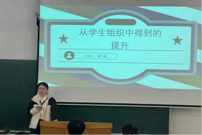 高乙阁同学讲述了她通过参加学生工作获得的成长。作为思政部部员和班级组织委员,她在学生工作中严谨认真,给部门和班级带来了正能量。她向大家分享如何能够平衡好学习和工作的关系,以达到提升学习成绩和个人能力的目的。