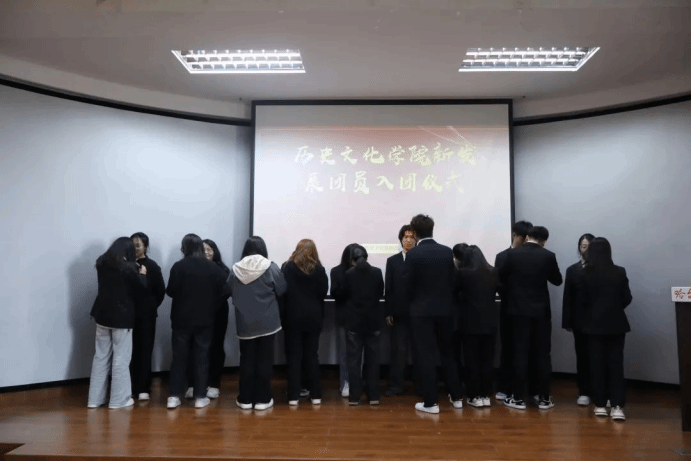 新团员们整齐站立,右手握拳,高举至耳旁,目光坚定,声音洪亮地宣誓,这是他们对共青团组织的承诺,也是他们青春的宣言。