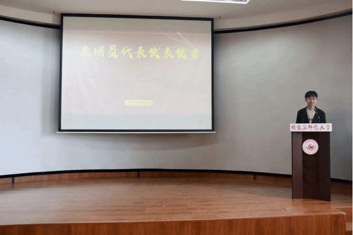 刘金鹏同学作为老团员代表发言,他呼吁新团员应当坚定理想信念、脚踏实地、共勉前行,在奋斗中绽放青春光彩。