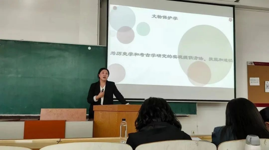 首先是江楠老师从“文物保护技术是什么?”开题,介绍了文物保护技术是一门多学科交叉、文理兼有的学科,文物保护学为历史学和考古学研究的实现提供了方法、技能和途径,并且向学生们提供一些书单,最后她说到:“让我们一起努力,不要让文化遗产变为文化遗憾。”