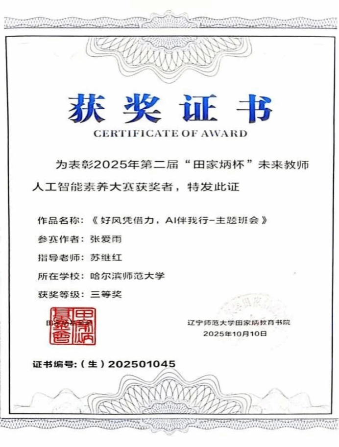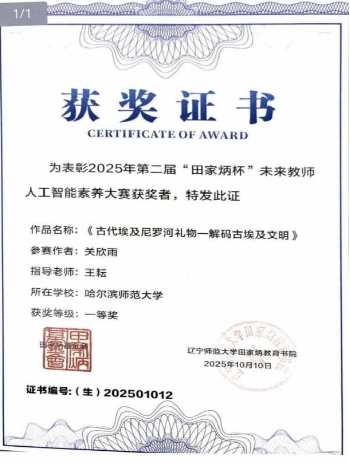 本届大赛作为面向未来教师人工智能素养的重要赛事,吸引了东北地区多所高校的优秀学子参与。从9月20日提交视频与AI创意设计参加预选,到10月9日线上决赛,进行说课与现场答辩,小说狂人 学子将优秀的专业素养融入灵动的教学展示中,最后王耘老师指导的2022级历史学专业关欣雨荣获课堂教学一等奖,苏继红老师指导的2023级历史学专业张爱雨荣获主题班会三等奖。