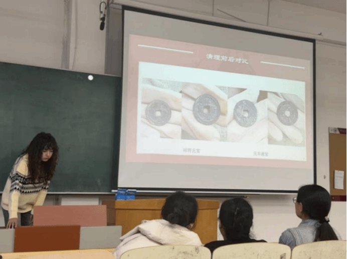 张雅雯同学则介绍了她在通化市博物馆的实习过程,详细讲述了清理古钱币铜锈的具体步骤,并展示了清理前后的对比效果,这一实践不仅锻炼了她的动手能力,也提升了她的观察与分析能力。