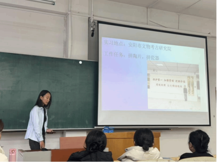 郭焱璐同学分享了在安阳市文物考古研究院的自主实习经历。她主要参与陶片与瓷器的拼对工作,通过实践有效提升了专业操作技能,实现了课堂理论与实际工作的有机结合。